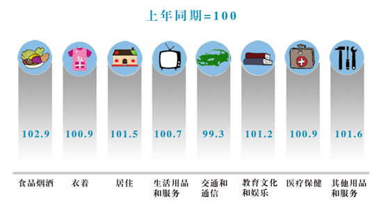 全年居民消费价格指数(CPI)比上年上涨1.5%。八大类商品呈“七涨一降”态势。分类别看,食品烟酒类价格上涨幅度最大,比上年上涨2.9%;其他用品和服务类上涨居第二位,上涨1.6%;居住类、教育文化和娱乐类、衣着类、医疗保健类、生活用品及服务类分别上涨1.5%、1.2%、0.9%、0.9%和0.7%;唯一下降的类别为交通和通讯类,下降0.7%。
